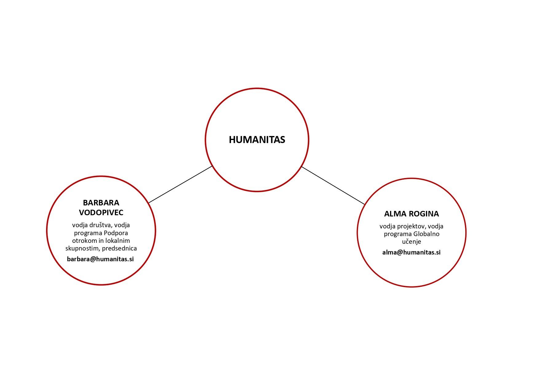 - Barbara Vodopivec ( barbara(at)humanitas.si ), vodja društva, vodja programa Podpora otrokom in lokalnim skupnostim, vodenje projektov, predsednica društva