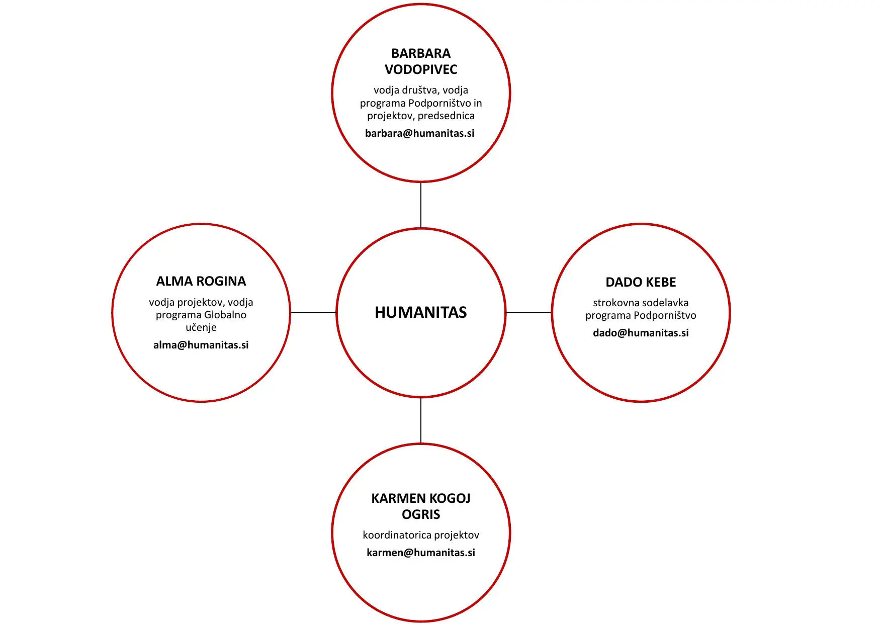 • Barbara Vodopivec ( barbara(at)humanitas.si ), vodja društva, finančne zadeve, vodja programa »Podporništvo«, vodenje projektov, predsednica društva
